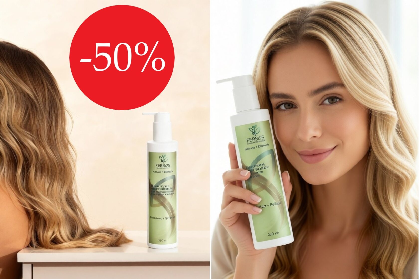 Мы впервые запускаем настолько выгодную акцию. Все шампуни со скидкой 50%, а наборы с бальзамом для волос еще на 25% выгоднее!